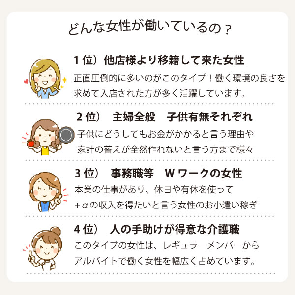 今では一般職との掛け持ちをして、週に2~3回のアルバイト女性が多く在籍しております。安心を得たい女性が世の中増えてきている現状が、こういった傾向を生んだのではないかと思います。